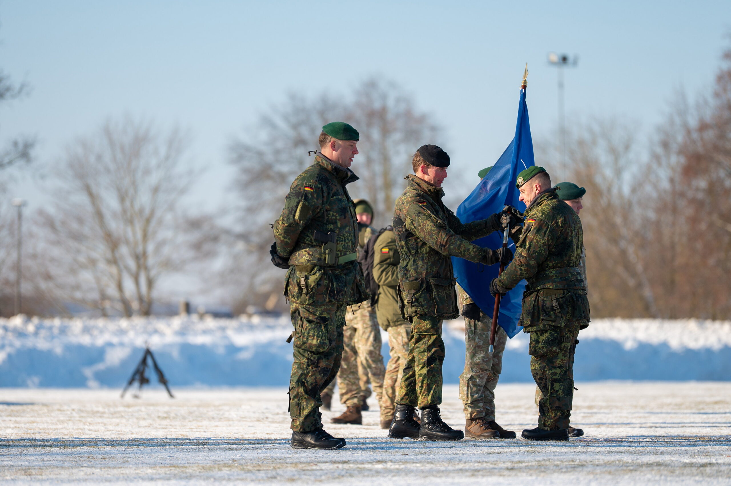 Ceremonijos metu Lietuvos kariuomenės Sausumos pajėgų vadas brigados generolas Nerijus Stankevičius perdavė Vokietijos kariuomenės Sausumos pajėgų vadui gen. ltn. Christian Freuding  NATO vėliavą, kuri yra Daugianacionalinės kovinės grupės Lietuvoje vėliava. Vokietijos kariuomenės Sausumos pajėgų vadas vėliavą, kaip vadovavimo simbolį perdavė Vokietijos šarvuotosios brigados 45-osios „Lietuva“ vadui brigados generolui Christoph Huber. Vėliavos įteikimo ceremonija – tradicija, nuo seno žyminti vadovavimo ir atsakomybės perėmimą. Istoriškai ji simbolizuoja padalinio garbę, tapatybę ir ryžtą, todėl vėliavos perdavimas visada laikomas išskirtiniu pasitikėjimo ir bendrystės simboliu.
